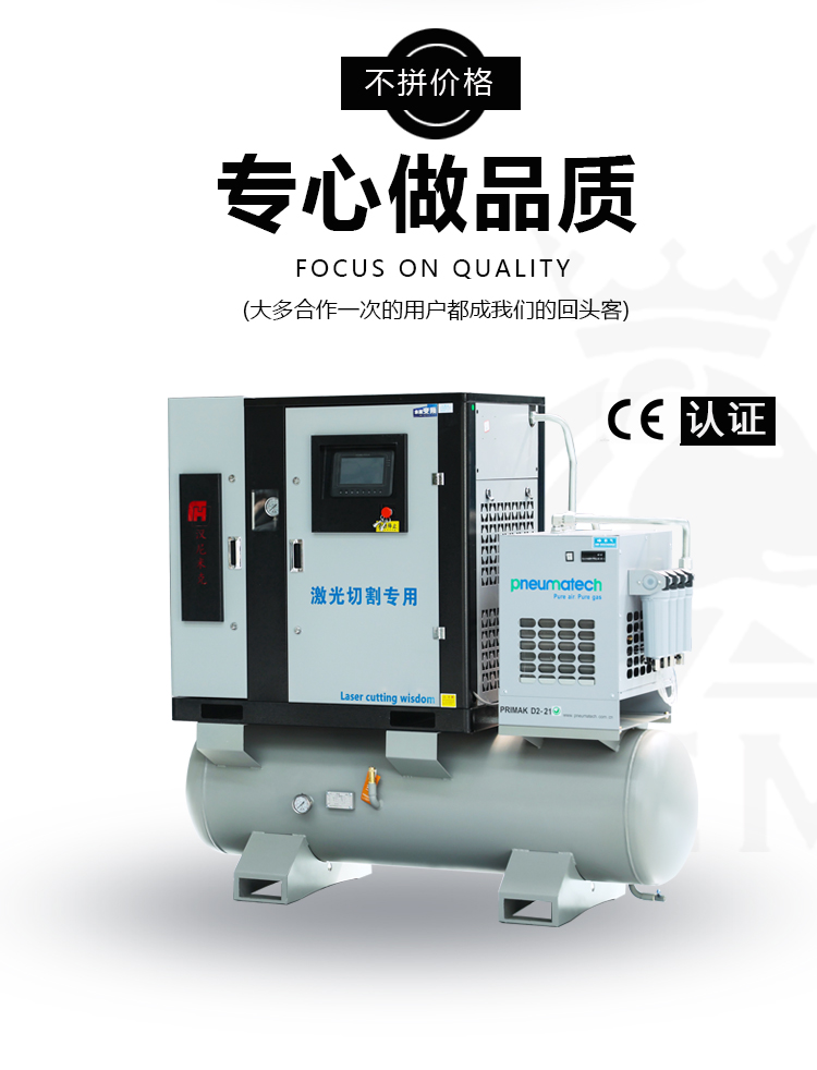 无极汉尼米克一体式螺杆空压机,激光切割行业专用,产品四合一设计,含螺杆空压机,储气罐,纽曼泰克的冷干机,五级过滤,安装方便占地面积小,防护等级IP54分体电机,超大油气分离器,五级精密过滤器,国际品牌纽曼泰克的冷干机,供气稳定,气源更纯净。可以有效提高激光切割的精度、减少能源消耗、提高工作效率。